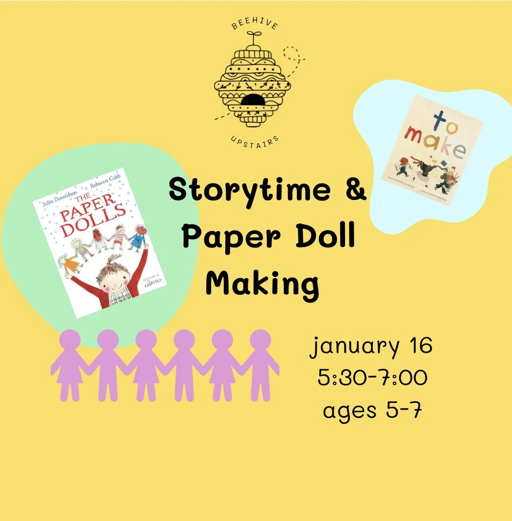 At this drop off class for 5-7 year olds, we will read The Paper Dolls by Julia Donaldson and To Make by Danielle Davis and then design and create our own paper dolls and scenery using paper, fabric, sequins, yarn and more! Make your paper doll with a fancy wardrobe, beach-ready or a superhero with a secret identity, you decide! Located at Beehive Upstairs, in studio 2M.